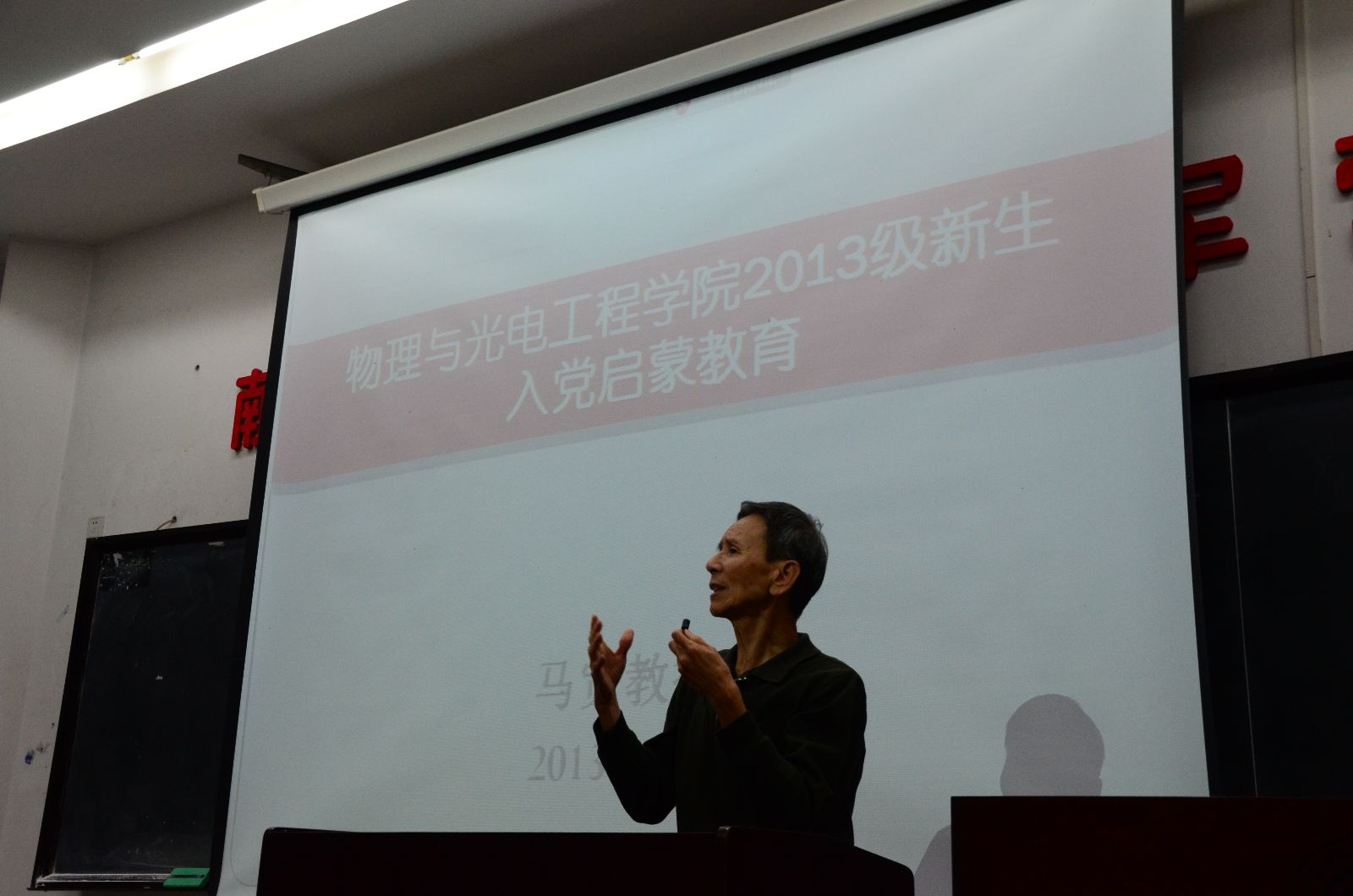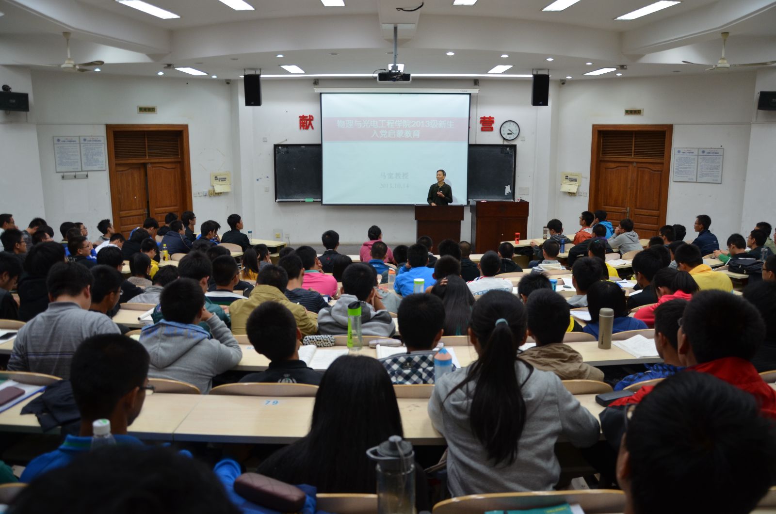 长期以来,入党启蒙教育一直是物理与光电工程学院新生入学教育的重要内容之一。10月14日,学院十分荣幸地邀请到了马宽教授,为雷速体育足球2013级全体学生开展入党启蒙教育。学院党委副书记兼副院长杨木老师,2013级辅导员俞洲老师出席了本次活动。