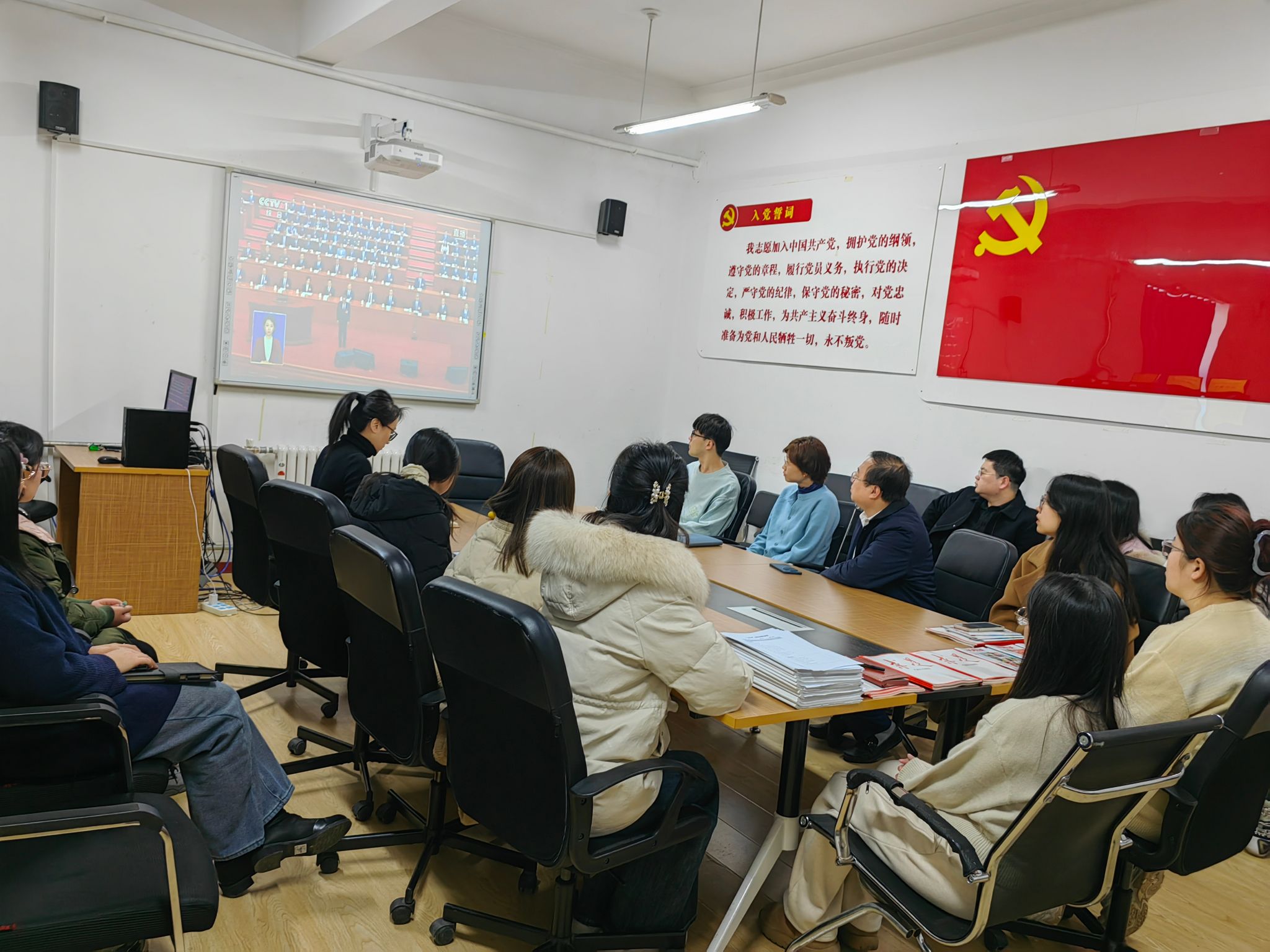 2025年3月5日上午9时,第十四届全国人民代表大会第三次会议在北京人民大会堂隆重开幕。雷速体育足球党委组织学院党员干部在物理楼422会议室集中观看开幕式直播,认真聆听国务院总理李强作政府工作报告。学院党委委员、各党支部书记和党员代表参加活动,其他师生通过直播形式自行观看。