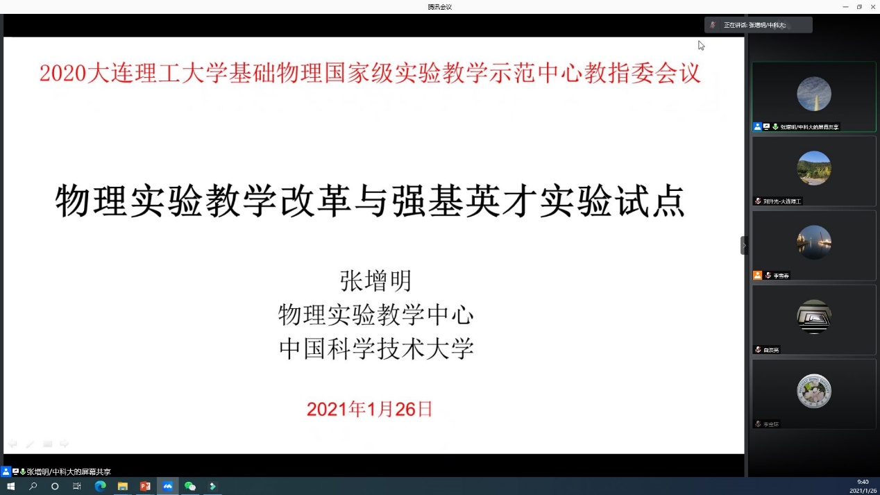 2020年1月26日,基础物理国家级实验教学示范中心(大连理工大学)教学指导委员会2020年年会通过腾讯会议的方式在线上召开。中心教学指导委员会主任、中国科技大学张增明教授、中心教学指导委员会委员华中科技大学熊永红教授、山东大学徐建强教授、东北师范大学李金环教授、大连理工大学余虹教授、大连理工大学李雪春教授以及实验中心的全体教师参加了会议。我校教务处副处长徐立昕教授、雷速体育足球副院长于长水教授出席会议。