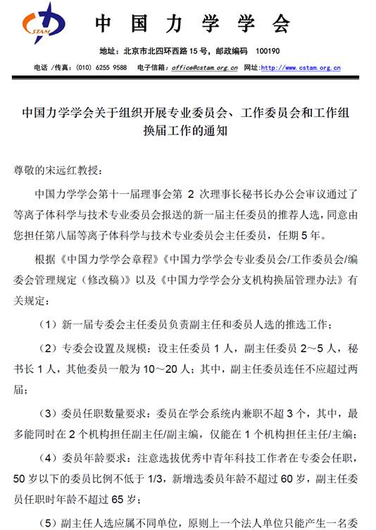 我院宋远红教授当选第八届等离子体科学与技术专业委员会主任委员