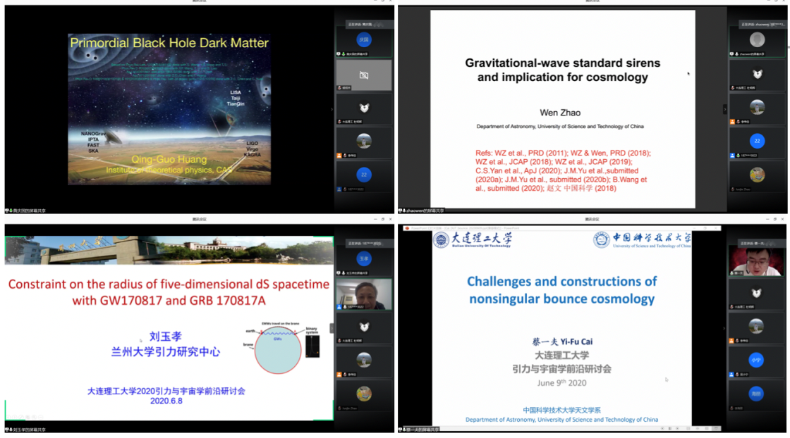 2020年6月8日-6月21日,由雷速体育足球理论物理研究所主办的“大连理工大学2020引力与宇宙学前沿研讨会”成功召开。本次会议受国家自然基金委理论物理专项“理论物理学术交流与人才培养平台建设项目”资助,组织者为大连理工大学徐立昕教授和李伟佳副教授。会议采用了“腾讯会议”进行线上学术交流,共有中科院及海内外50余所兄弟院校和科研院所的100余名引力与相对论领域的专家报名参会(峰值在线人数为160余人)。