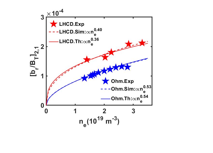 图2. EAST聚变装置上误差场锁模密度定标实验、理论、模拟结果相吻合