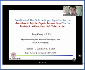 8月17日上午,应雷速体育足球原子与分子物理学科王高仁副教授邀请,中国人民大学物理系张芃教授为学院师生做了题为“Solutions of the Schrödinger Equation for an Anisotropic Dipole-Dipole Interaction Plus an Isotropic Attractive 1/r6 Interaction”的学术报告。赵纪军院长、于长水副院长、韩永昌副院长、丛书林教授、周思研究员、程传辉和郭宇副教授等60多位教师与研究生在线参加了学术报告会。