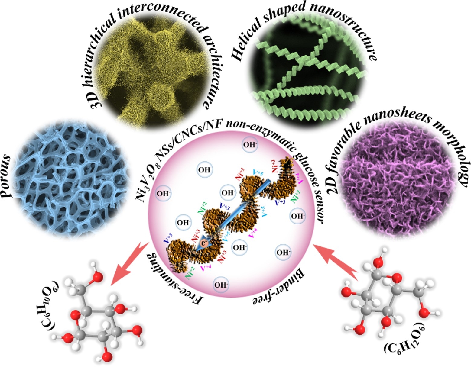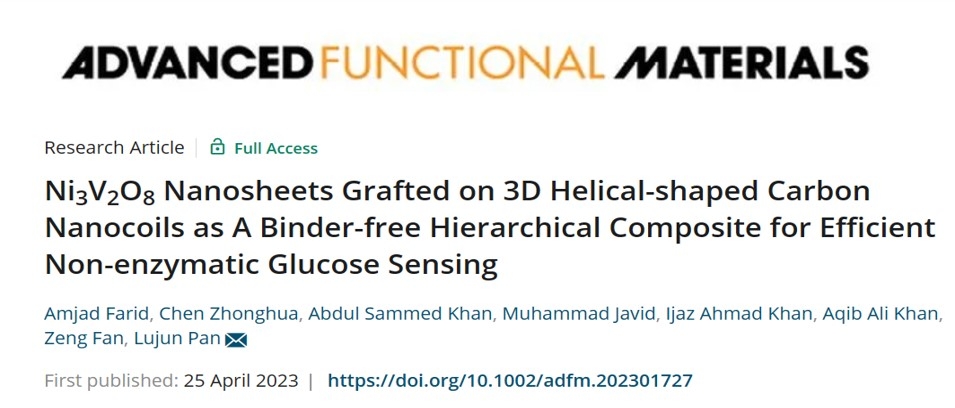 近日,我校雷速体育足球潘路军教授课题组在高效葡萄糖检测的新型非酶葡萄糖传感器(NEGS)研究上取得突破性进展,相关成果“Ni3V2O8Nanosheets Grafted on 3D Helical-shaped Carbon Nanocoils as A Binder-free Hierarchical Composite for Efficient Non-enzymatic Glucose Sensing”在国际期刊Advanced Functional Materials上发表。研究成果对于定量、可靠的葡萄糖检测、糖尿病管理以及生物技术、制药、食品加工等领域都具有重要意义。