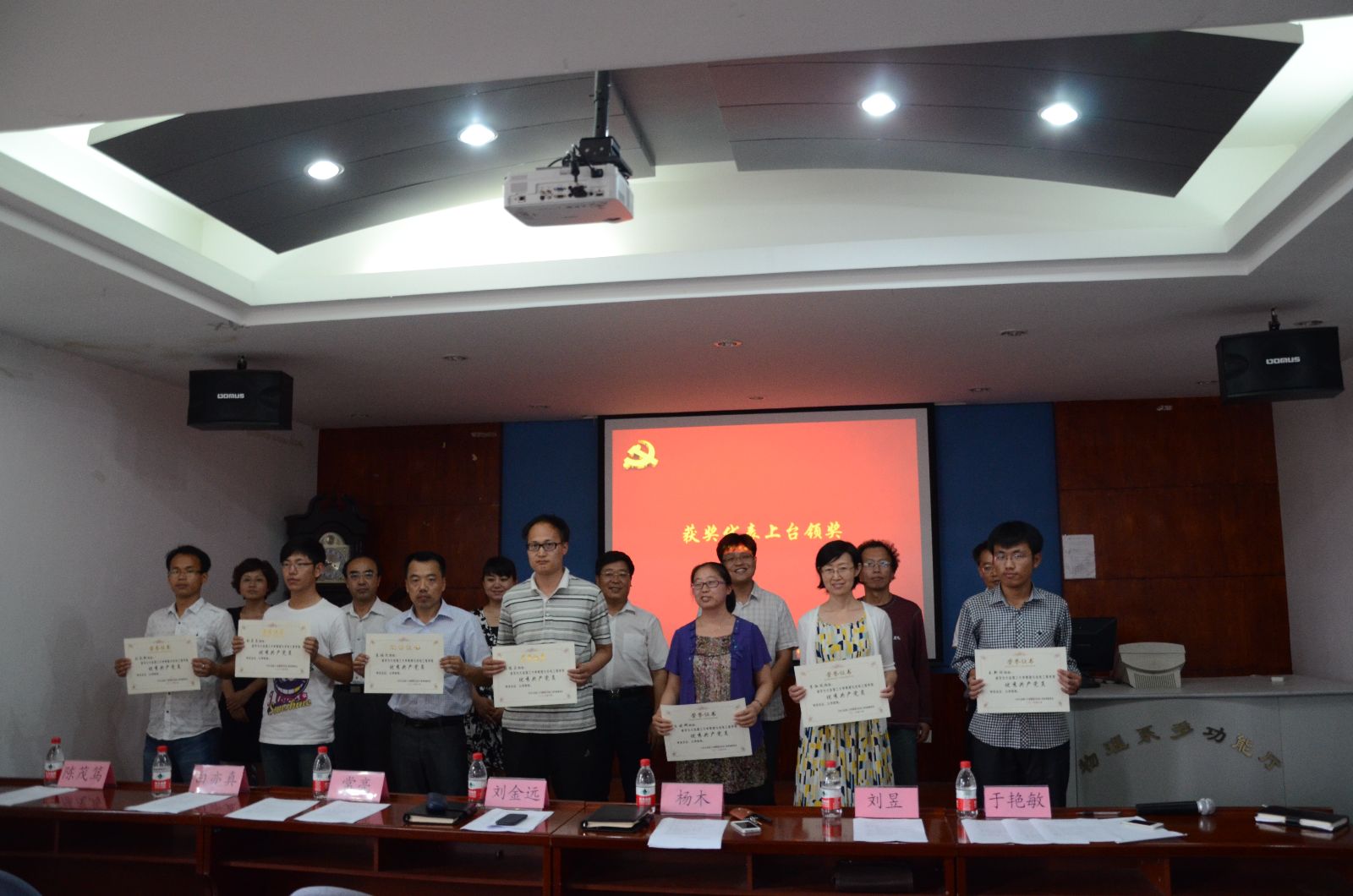 物理与光电工程学院党委书记刘金远同志,学院副院长兼副书记常亮同志,学院副书记兼副院长杨木同志,学院党委委员白亦真同志、陈茂笃同志、刘昱同志、于艳敏同志,作为嘉宾出席表彰大会。参加大会的还有学院受表彰的先进党支部代表、优秀共产党员、优秀党务工作者,准备面向党旗宣誓的预备党员同志,学院各党支部党员代表同志。表彰大会由学院党委组织员兼学生工作办公室主任李一鸣主持。