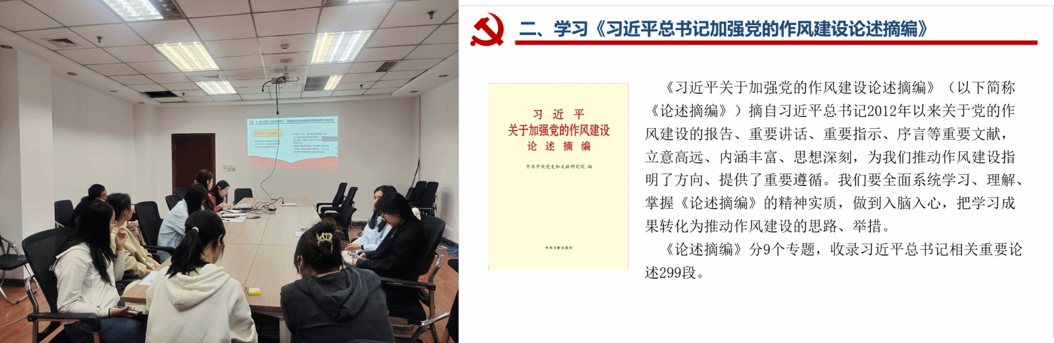 会议第二项,由赵博同志带领全体党员学习《习近平关于加强党的作风建设论述摘编》(以下简称《论述摘编》)。该书汇集了习近平总书记自2012年以来关于作风建设的重要讲话,分9个专题,共收录299段重要论述,内容系统、思想深邃。赵博同志指出,作风建设关乎党的形象和事业成败,全体党员要认真研读《论述摘编》,深刻领会其精神实质,切实把作风建设要求融入日常学习、科研和服务工作中,持续增强党性修养,推动各项工作见实效。