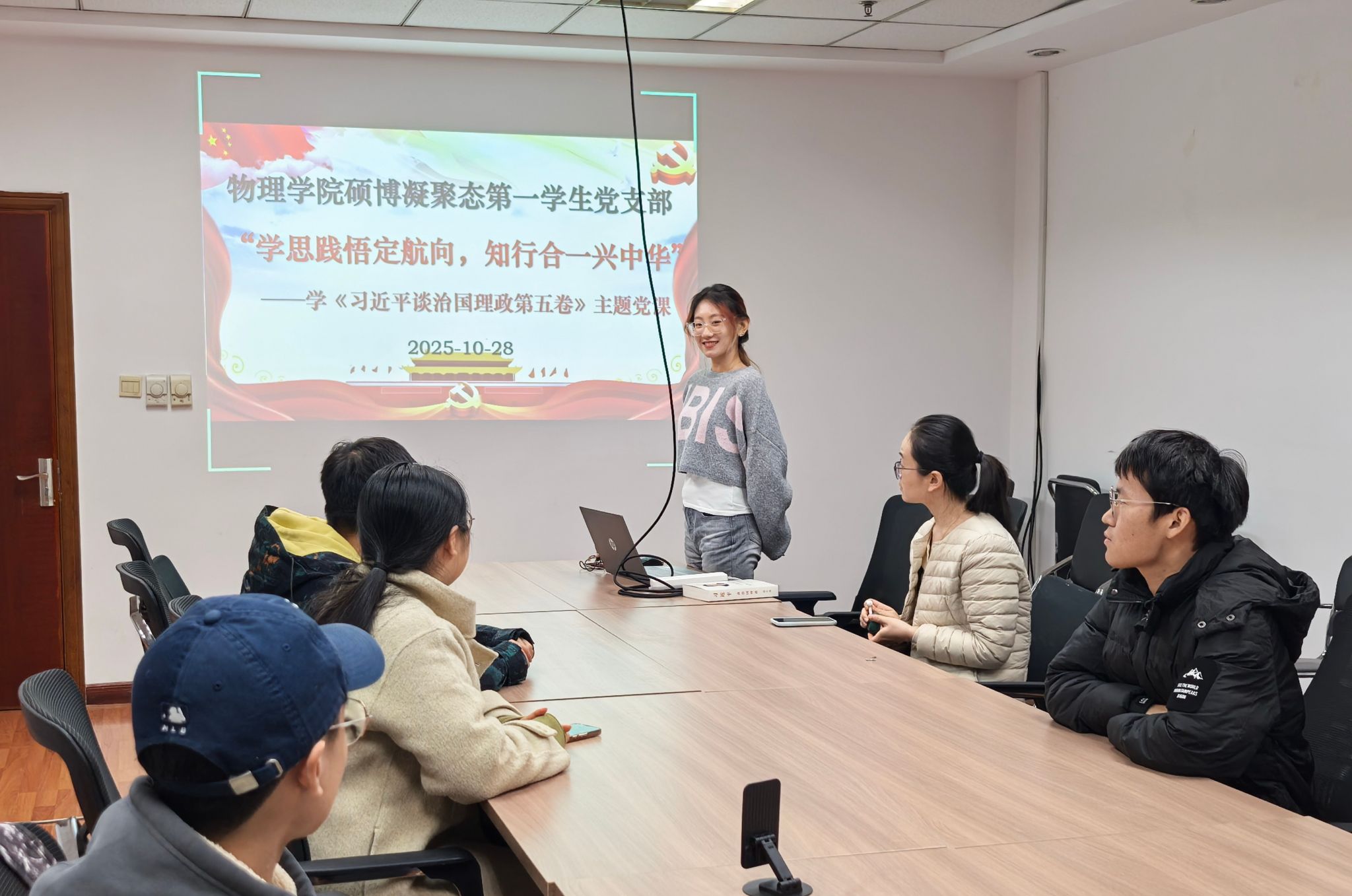 会议第二项,开展学习《习近平谈治国理政》第五卷主题党课暨主题党日活动。首先,郑祉溦同志以“理论脉络+时代价值”为切入点,系统梳理《习近平谈治国理政》第一卷至五卷的演进逻辑并结合中共中央办公厅关于组织学习第五卷的通知要求,将全书十八个专题划分为五大篇章,以金句学习和案例分享的形式进行展开,强调“读原著、学原文、悟原理”的重要性。理论学习后,活动进入互动研讨环节。党员们围绕党课设置的三大思考题进行热烈交流,结合科研学习实际分享感悟,现场交流氛围热烈,既有思想碰撞,又有情感共鸣。会议最后,全体党员同志表示作为物理学科的硕博党员,要将“学思想”与“做科研”紧密结合,既要在理论学习中筑牢信仰之基,也要在科研攻关中践行初心使命,为以中国式现代化全面推进中华民族伟大复兴贡献青春力量。