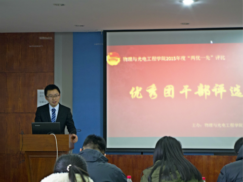 12月30日,物理与光电工程学院2015年度“两优一先”优秀团干部评选大会于当天下午2点在物理系楼322举行。此次评选活动以表彰先进、树立典型、促进工作,进一步营造创先争优的浓厚氛围,不断增强基层团组织的吸引力、凝聚力和战斗力为目的展开。到场的评委老师有物理与光电工程学院团委书记兼2012级队辅导员佟西原,2013级队辅导员俞州,2014级队辅导员梁勇,2015级队辅导员纪丹红。
