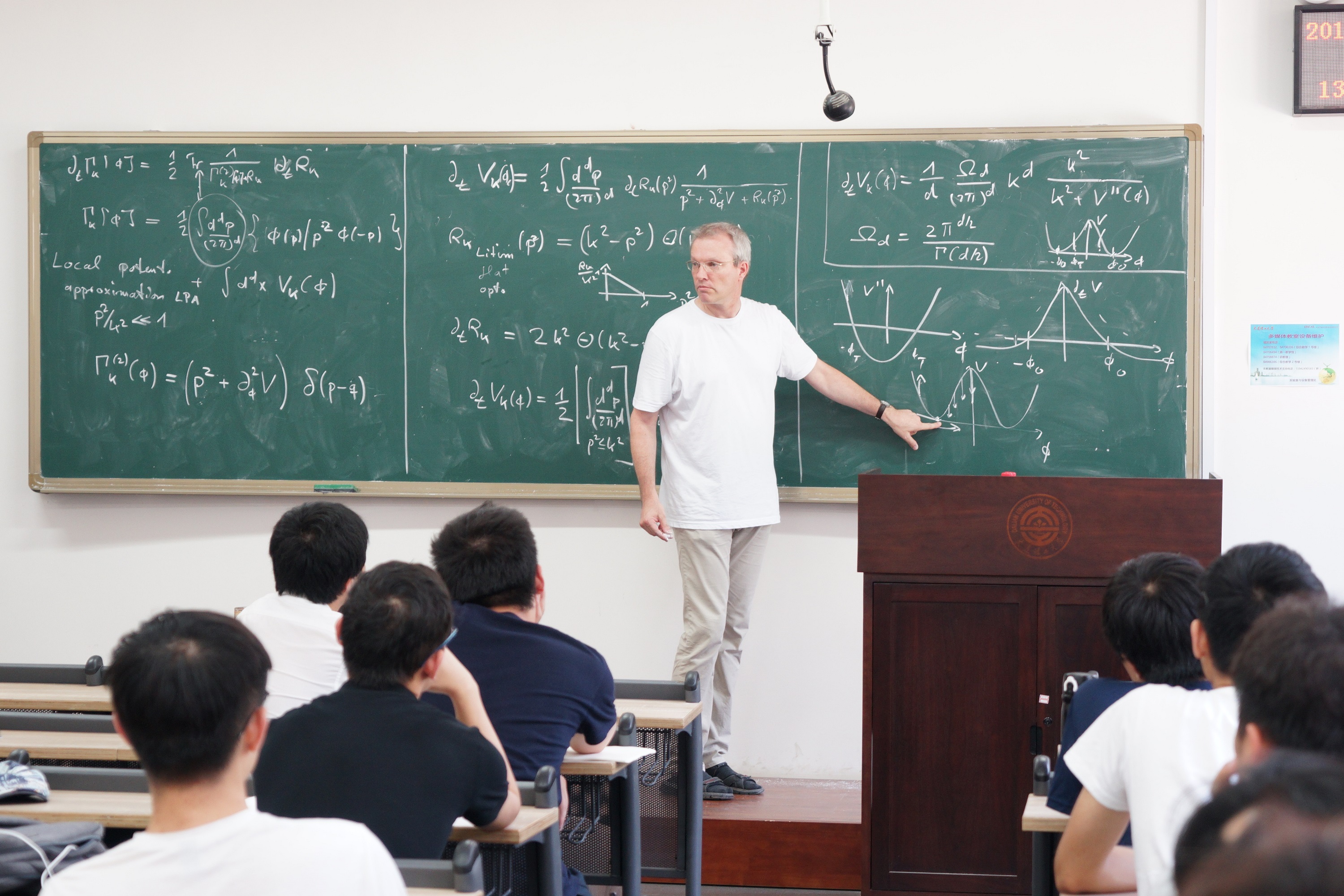 在这两天的过程中,Pawlowiski教授讲解的夸克胶子等离子体及其相关理论正是当今理论物理研究领域的前沿课题内容。本次系列报告的主题是以泛函重整化群为基础的强相关QCD中物理和QCD相结构。Pawlowiski教授介绍QCD相图和其中包含的物理以及非微扰QCD计算中的泛函方法和连续性方法,着重讲解泛函重整化群方法,带着在场同学了解有限温情况下杨-米尔斯理论和相关结构并学习高能重离子碰撞中的动力学知识。现场同学也都对此方向有着高涨的学习热情。面对没有理解的理论知识,他们更是虚心请教,主动与Pawlowiski教授在黑板上讨论。这种激烈的学术交流氛围是本次系列讲座中不少见的一道风景线,体现着学子们求知若渴的学习精神。