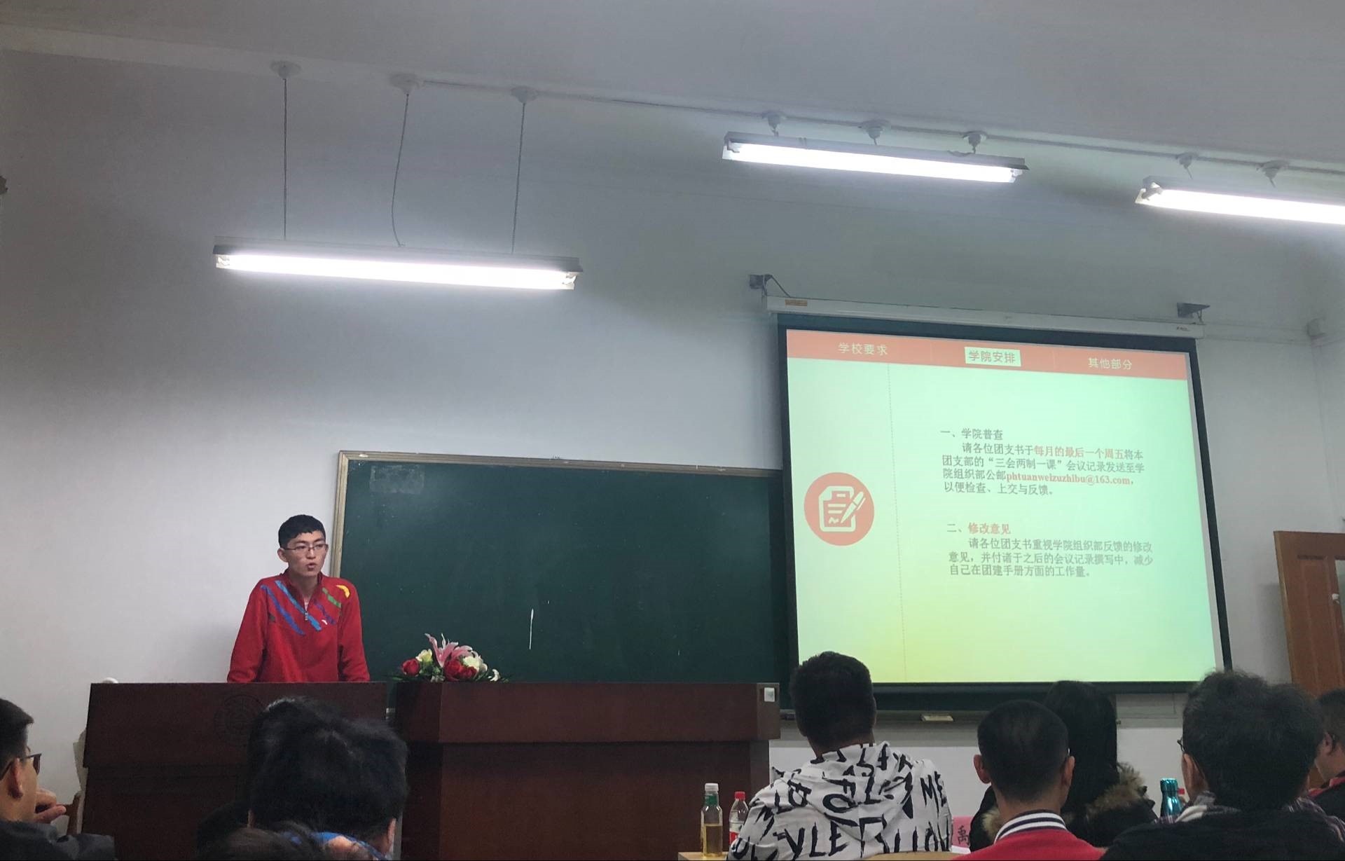 2018年10月11日晚六点,为使各级团支书以及组宣委能更好进行团支部建设,加深对团委了解,同时,使18级团支书级组宣委更快的熟悉团建工作,本学年雷速体育足球团支部建设工作说明会在第二教学112馆如期举行,到场的嘉宾有雷速体育足球团委副书记刘禹君、团委理论学习中心主任林子超、团委组织部部长何浩以及中白1801团支书臧袁昊。