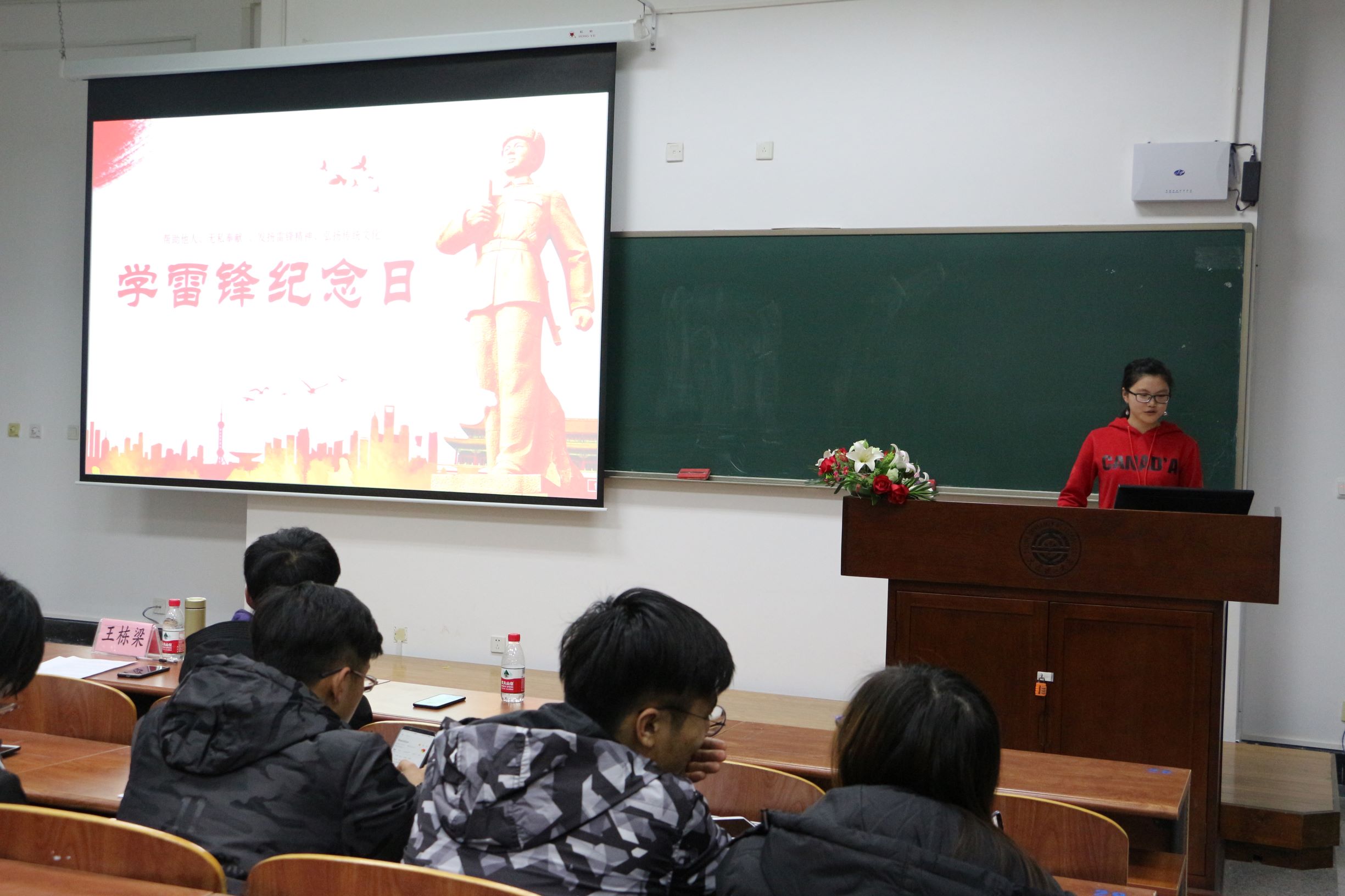 接下来,温昕分别从个人经历、雷锋事迹、雷锋名言、纪念日、伟人题词五个方面进行“雷锋精神”宣讲。她强调“雷锋精神是中华民族传统美德的一种积淀,是一种随着时代进步而不断发展的与时俱进的精神。雷锋那种全心全意为人民服务,把有限的生命投入到无限的为人民服务中去的精神,那种干一行爱一行,立足岗位艰苦奋斗的螺丝钉精神,那种对同志、对群众像春天般温暖,舍己为人,助人为乐,我为人人,人人为我的精神,是在构建和谐社会中必须大力发扬倡导的。”并结合现实,指出雷锋精神于今天的意义,鼓励大家学习雷锋、帮助他人、无私奉献 、发扬雷锋精神、弘扬传统文化。