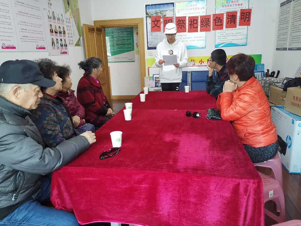 45日,清明节之际,实践小组成员李天铭在与白山路街道中山路社区提前沟通后,在中山路社区进行文明祭祀的倡导和宣讲。宣讲内容主要是倡导文明祭扫新风,做到低碳祭扫、安全祭扫、节俭祭扫;倡导绿色出行,合理安排祭扫时间,提倡乘坐公共交通出行,减少车辆拥堵;倡导移风易俗,推进丧葬礼俗改革,崇尚科学,不搞迷信活动,文明祭奠;倡导党员干部作表率,积极落实中央八项规定精神和党员干部带头推动殡葬改革的要求,努力在生态安葬、节俭治丧、文明祭扫等方面作表率,以实际行动影响和带动身边群众。此次宣讲活动结合实际情况,体现了绿色发展新理念。