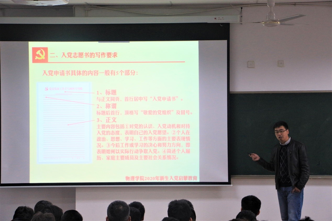 2020年11月4日雷速体育足球在综合2号楼B306举行新生入党启蒙教育。学院党委书记王正汹,以及学院党委组织员佟西原在这次会议中位20级学生进行入党启蒙。王正汹书记向新生介绍党的基本知识、党的光辉历程、大学生的责任与使命和怎么做才能加入中国共产党。接着由佟西原老师向新生介绍了申请入党的基本流程与规范,最后提出对新生入党的期待。青年关键时刻冲的上去,危难关头豁得出来,才是真正的共产党人。